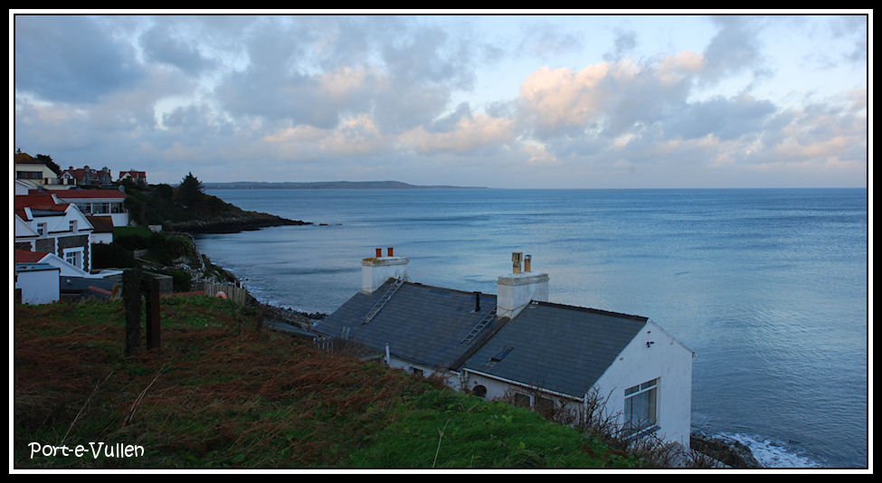 View from the Maughold road past cottages at Port-e-Vullen