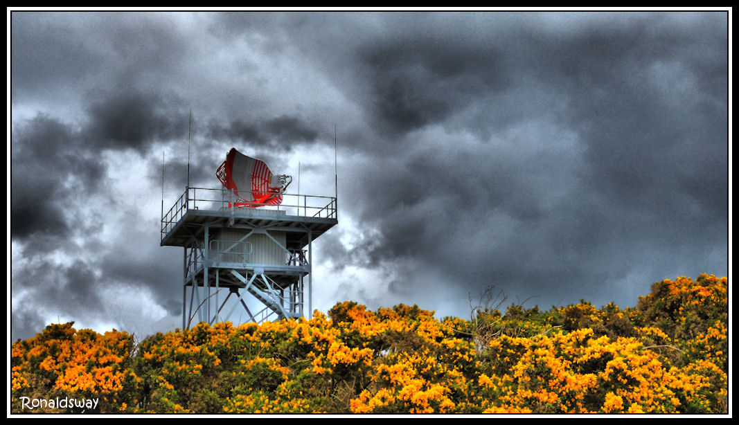 An HDR picture of the Ronaldsway Selex radar on Turkeyland Hill wih cloudy skies behind