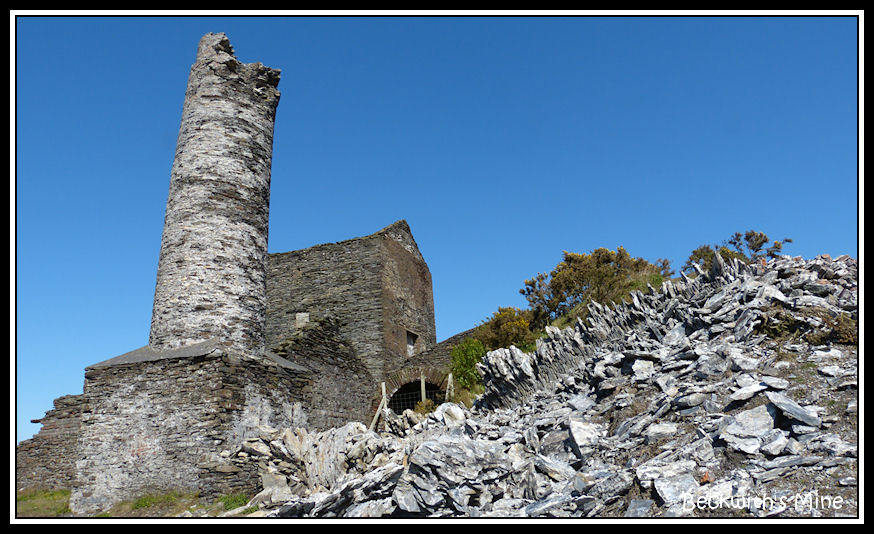 A closer view showing the collapsed section of the chimney lying on the ground
