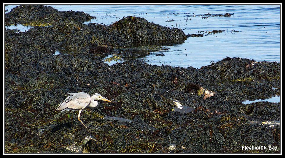 The heron hunting amongst seaweed