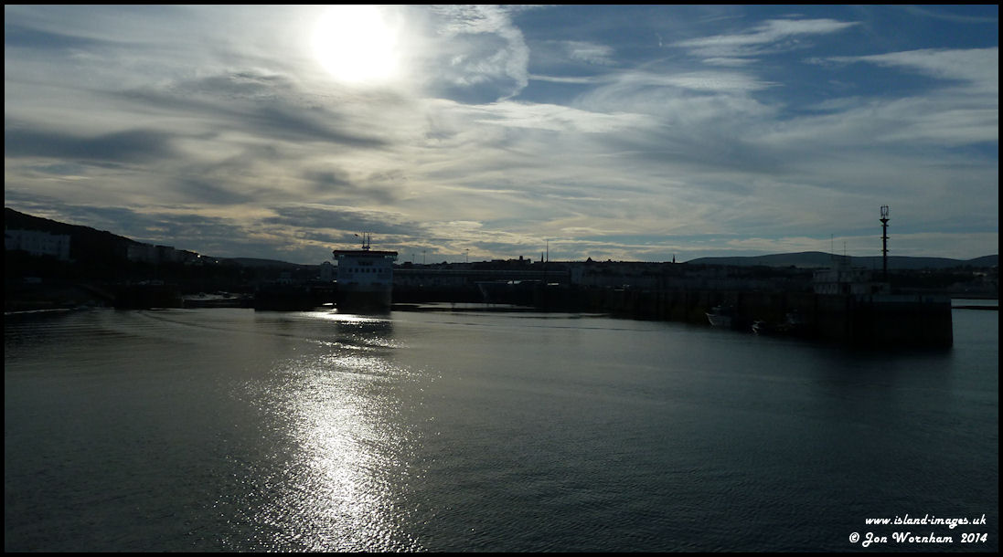 Looking into the evening sun with the 'Ben-my-Chree' on her berth