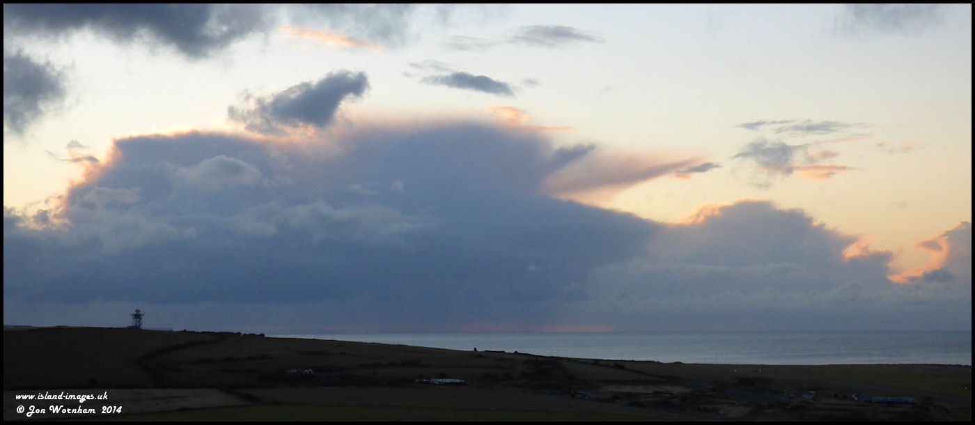 Dawn at Ronaldsway and a heavy rain shower passes to the east of the island