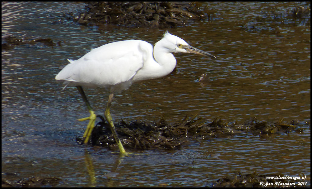 Little egret hunting in the shallows, Ramsey Harbour at low tide
