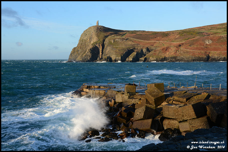 Waves break over the remains of the ill fated 1863 outer breakwater at Port Erin, with Bradda Head behind