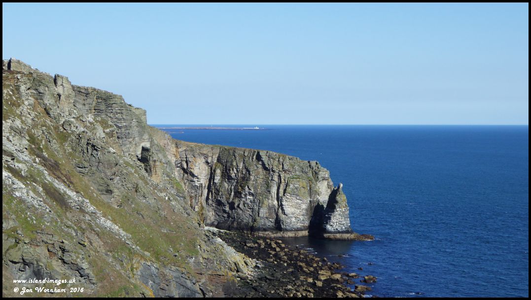 Looking east past The Chasms and the Sugar Loaf rock, Langness lighthouse in the distance