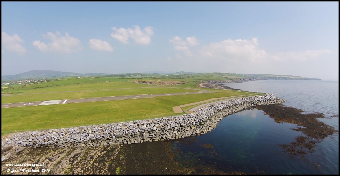 The promontary extension at Ronaldsway, constructed in 2009 to allow the main runway to be extended and incorporate larger Runway End Safety Areas. Landing aircraft aren't allowed to touch down until they reach the 'piano keys' markings.