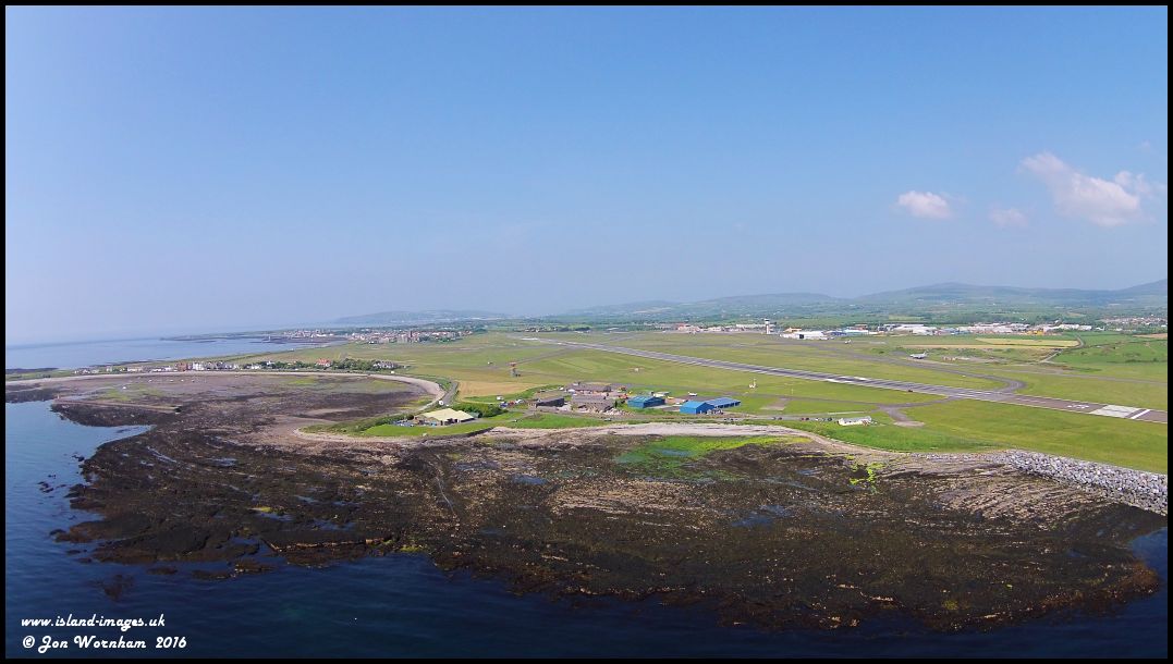 Looking west across Ronaldsway Airport. The original grass Ronaldsway Aerodrome occupied the area between the old stone farm buildings (centre) and the start of the Derbyhaven houses