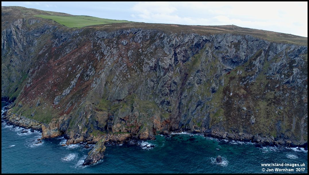 North Bradda Mine, showing the height of the cliffs. A footpath used to lead down the cliff face to the mine, but due to rock falls, it is now impassable.