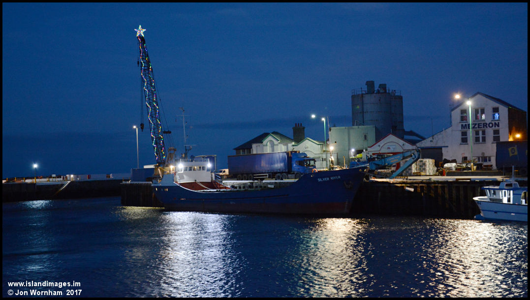 It's almost completely dark now with the harbour lights shimmering off the water and Mezeron Shipping's crane nicely decorated as a shooting star