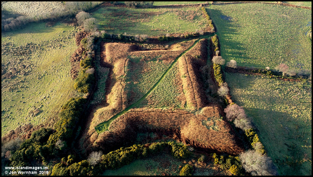 A near vertical view of the fort, the low winter sun angle accentuating its features. When it was in use around 1651 it would have featured a wooden stockade on top of the earth walls.