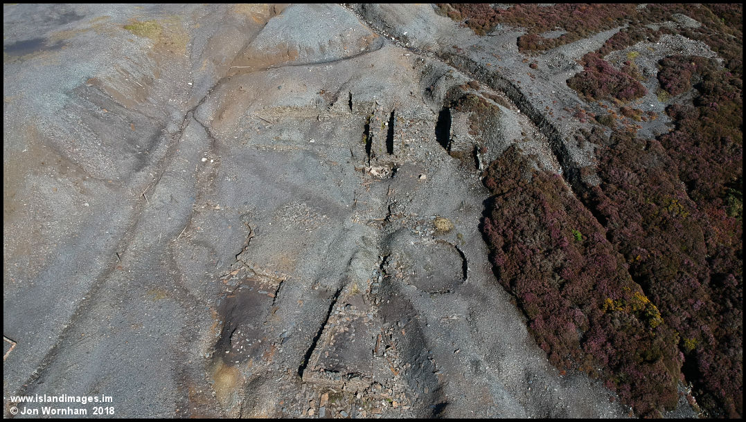 Vertical view of part of the washing floors at Beckwith's Mine. Top centre of the picture is the remains of a water wheel case.