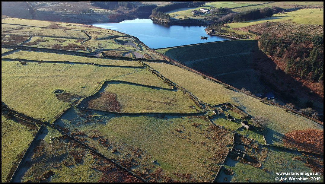 The Corrody, with the Keeil site to the left of picture and Sulby Reservoir behind. The low sun angle highlights the old field patterns, but sheep now roam freely over the area.