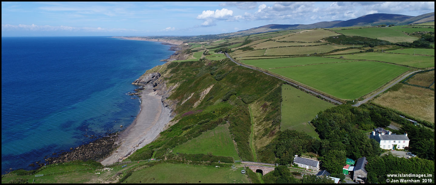 An aerial shot of the Lhiannag area taken in August 2018. It shows the road at the top of the cliffs, but the railway line constructed part way down, where it was subject to land slippages.