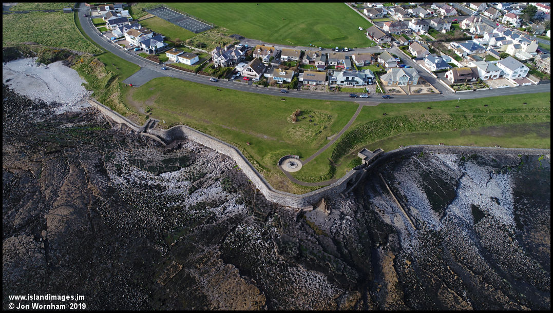 An almost vertical view of Kallow Point and the Mona's Queen Memorial.