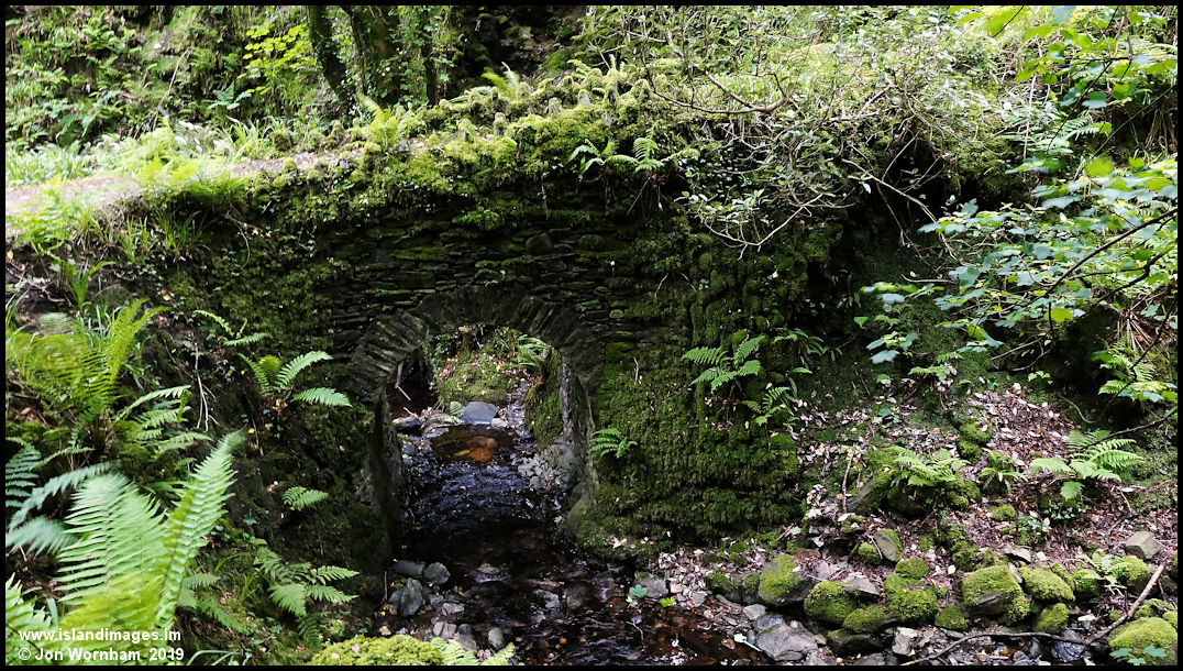 A rustic stone bridge just downstream from the waterfall.