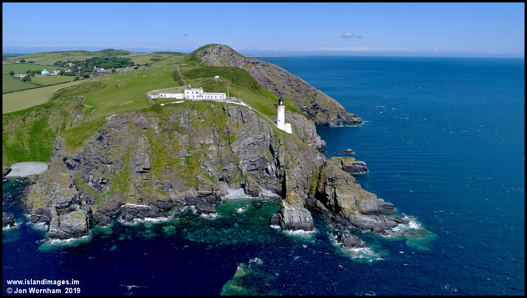 Taking the aerial camera lower to show how much the hill rises above the level of the lighthouse, making it invisible from much of Ramsey Bay.