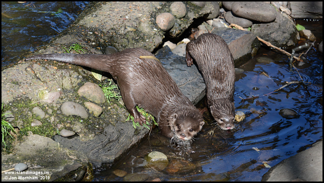 Two Small Clawed Otters explore in the stream.