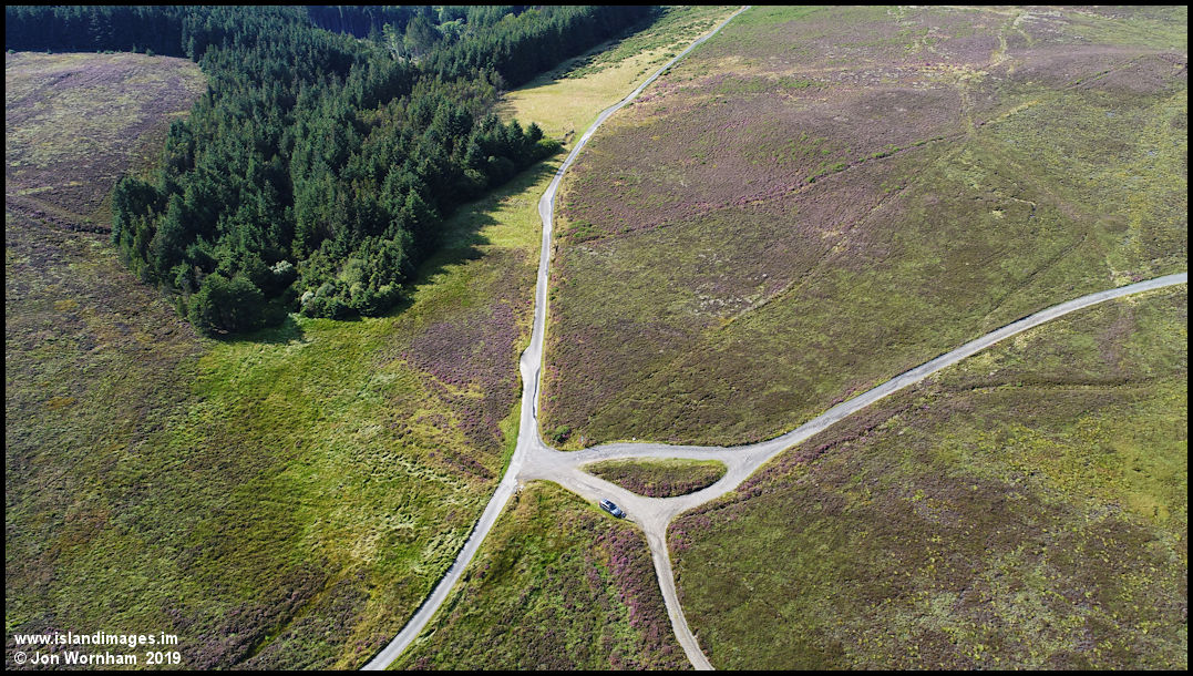 A near vertical view of the road junction in the hills. The Druidale road running from bottom left and descending down into Glen Dhoo with a green lane on the right to Sulby Glen. The bottom right track leads to Killabrega tholtan and a plantation.