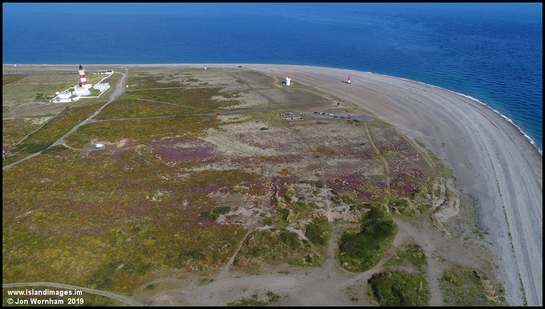 The northern tip of the Isle of Man at the Pont of Ayre, with heather and gorse colouring the heathland south of the lighthouses.