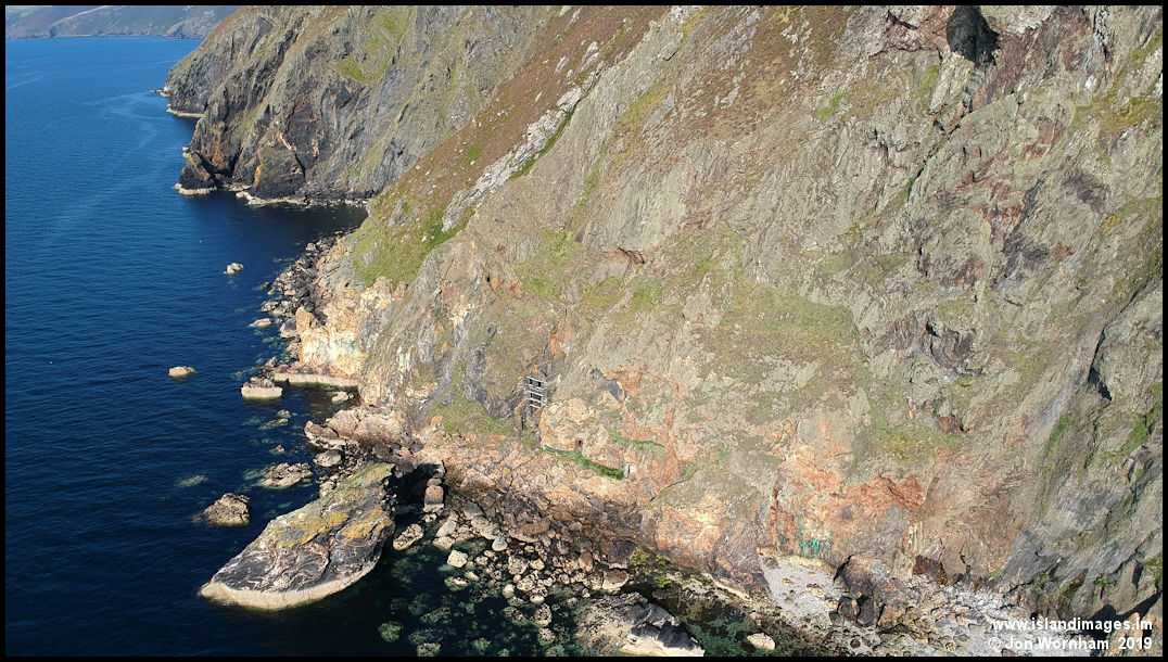 Taking the aerial camera down below cliff height for a better view of the old mine workings.
