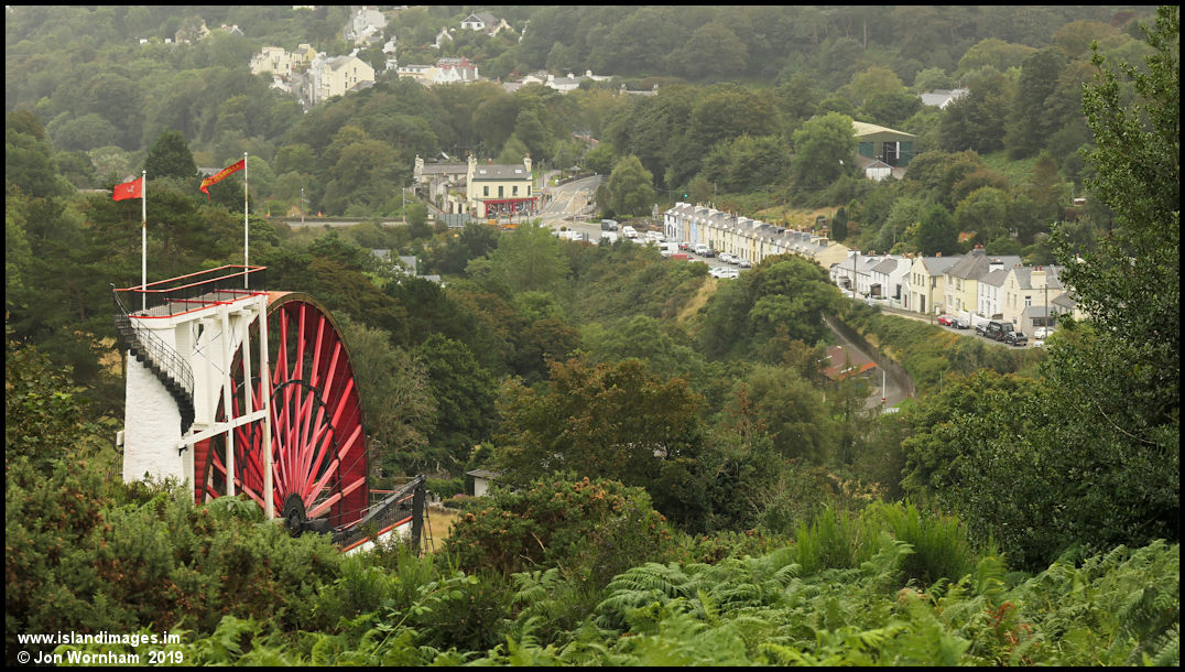 Walking back down the hill into Laxey and taking the view past the Laxey Wheel to the village.