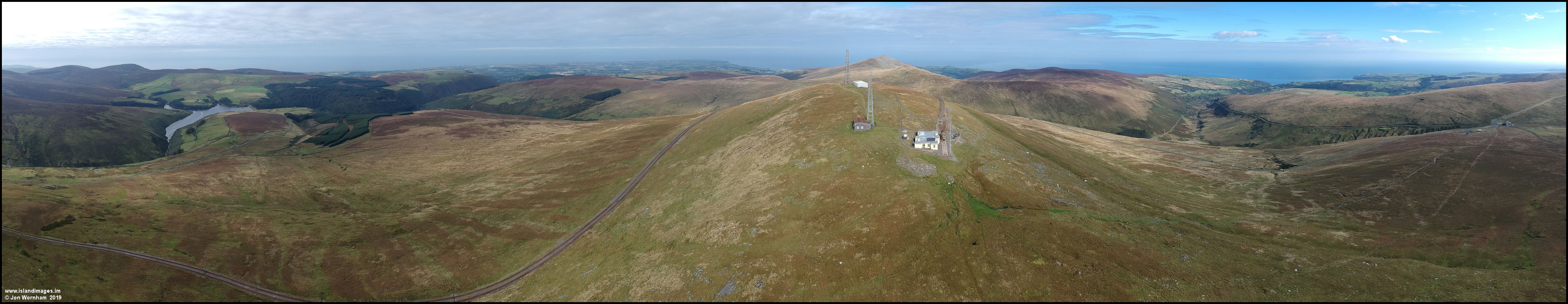 Snaefell Panorama, looking from the Sulby Reservoir on the left, across the summit and to Bungalow on the right. The mountain railway can be seen curving around to the summit station.