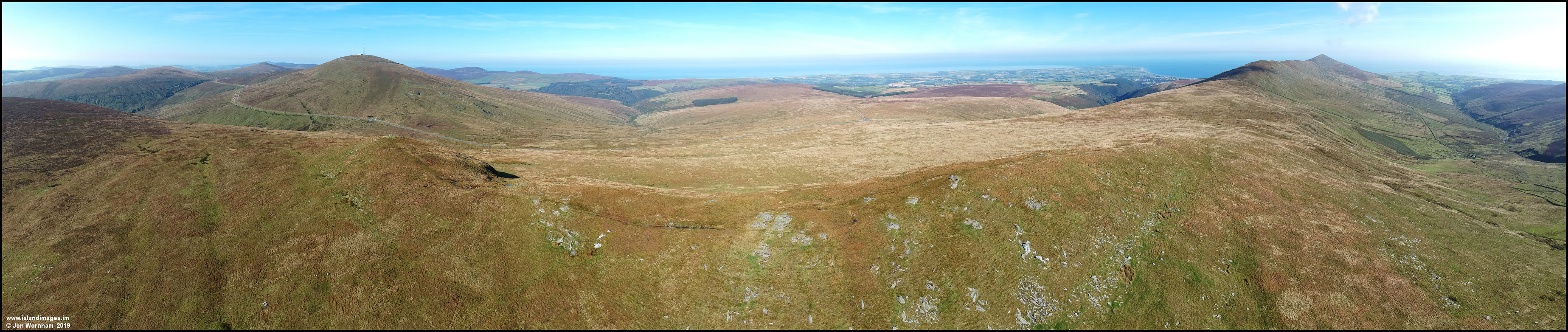 Panorama at Clagh Ouyr, with the Mountain Road curving past Snaefell on the left, then looking along the ridgeline to North Barrule, with the Upper Cornaa Valley on the right.