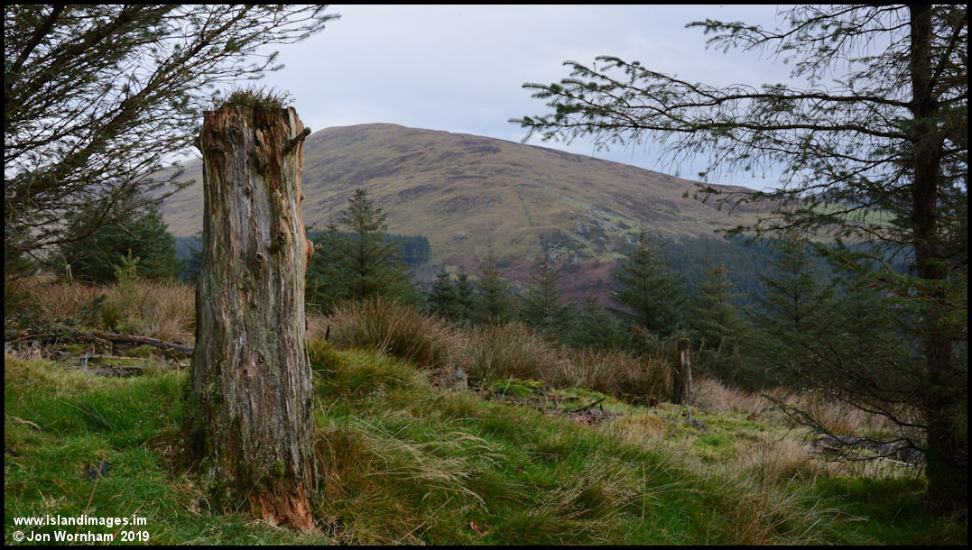 Tree stump and Carraghan. Selective felling of the conifers is allowing other vegitation to thrive.