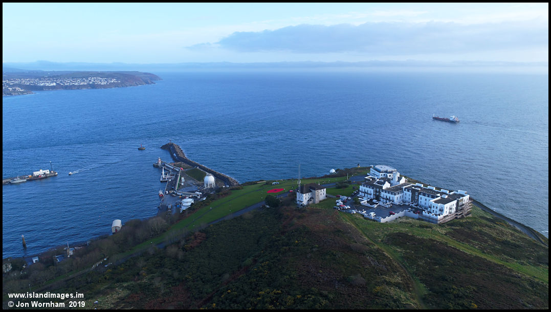 Douglas Head with tanker 'Stolt Cormorant' passing on approach to the harbour. The small boat entering the harbour has taken the Douglas Pilot out to the tanker, to bring her into port.