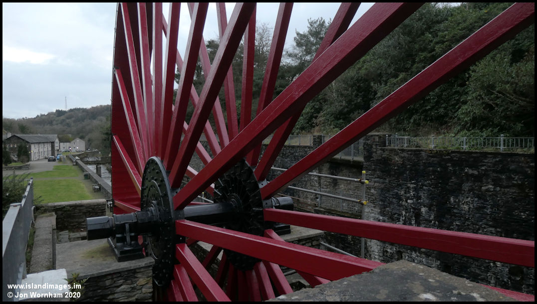 Looking through the spokes of the Snaefell Wheel, which has recently been repainted.
