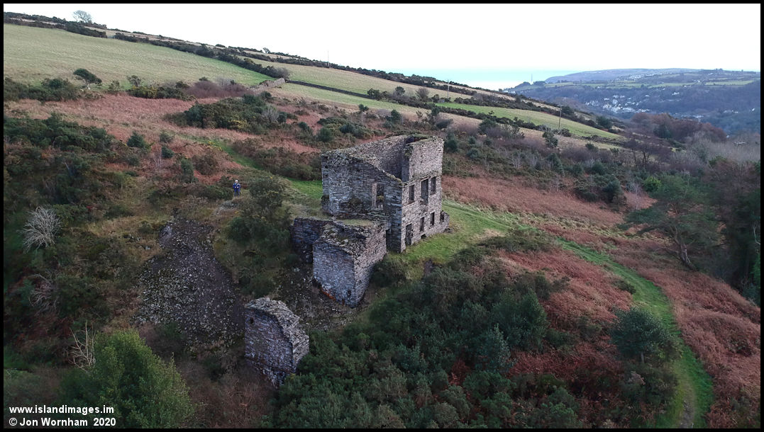 A lower level view of the water wheel case and remains of the aquaduct support, with the village of Laxey just visible in the distance.