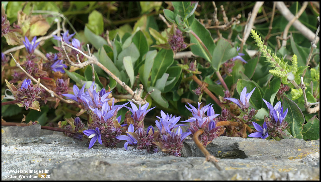 I don't have a name for these flowers growing out of the base of a stone wall.