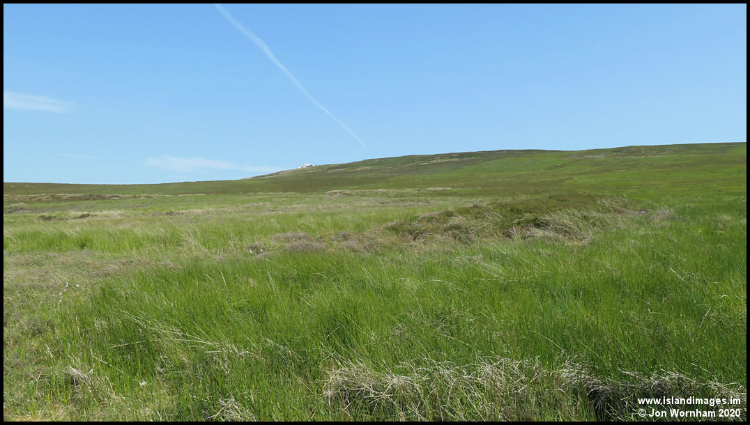 Continuing the walk to Ballamish, more or less following the contours around Slieau Managh before dropping down about 250 ft to the tholtan. This is a fairly easy walking grass area, but much is through knee high heather which can be hard work.