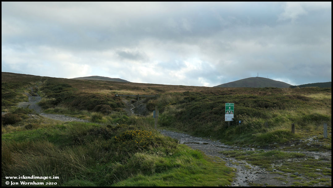 I've just left the moorland here and about to continue downwards on a (narrow) tarmac lane, but looking back up the track with Snaefell on the right.