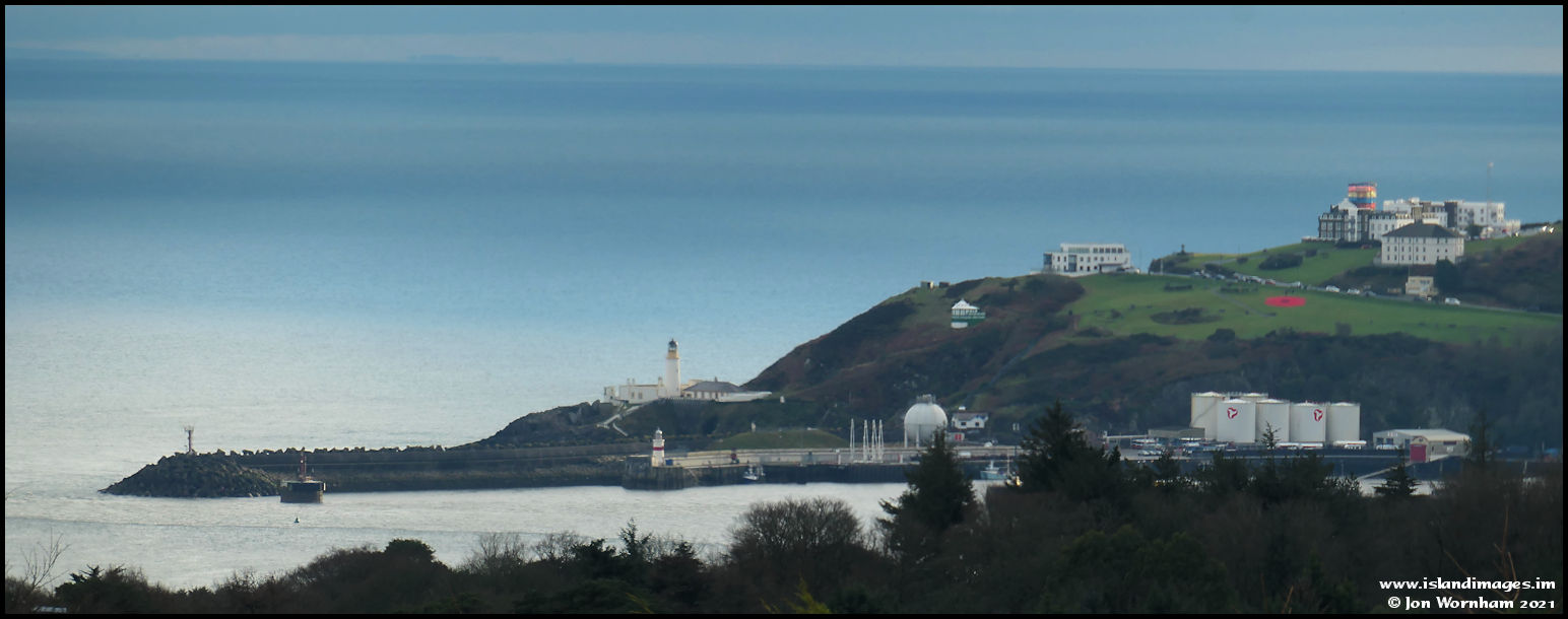 Zooming in for a closer look at Douglas Head and the lighthouses. The visibility really has improved as you can just see an outline of the mountains in North Wales on the horizon.