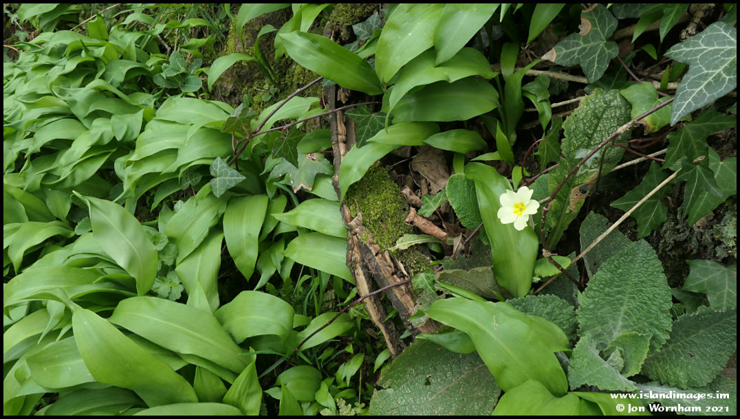 A lone primrose struggles through wild garlic and ivy.