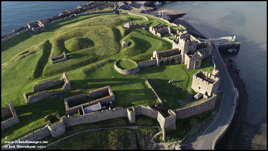 Climbing up a bit higher.  The low sun angle is highlighting the various earthworks within the castle.