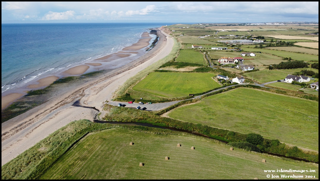 Flying inland a bit to look across the car park and some of the scattered houses at The Cronk. The smudge on the horizon is southern Scotland.