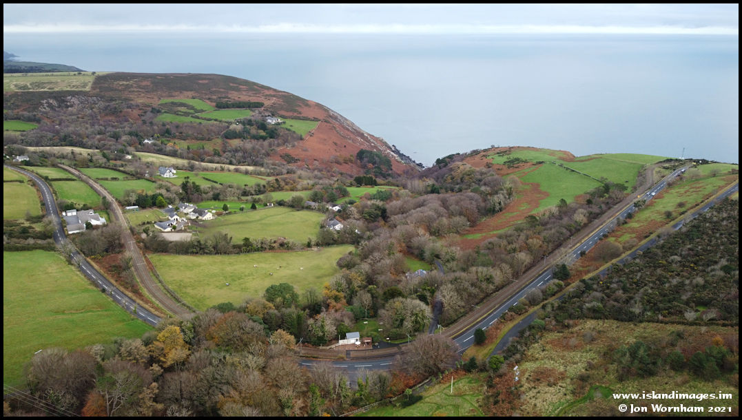 Looking down the Dhoon Glen with the 'Little Shed' cafe by the Manx Electric Railway tracks in the foreground.