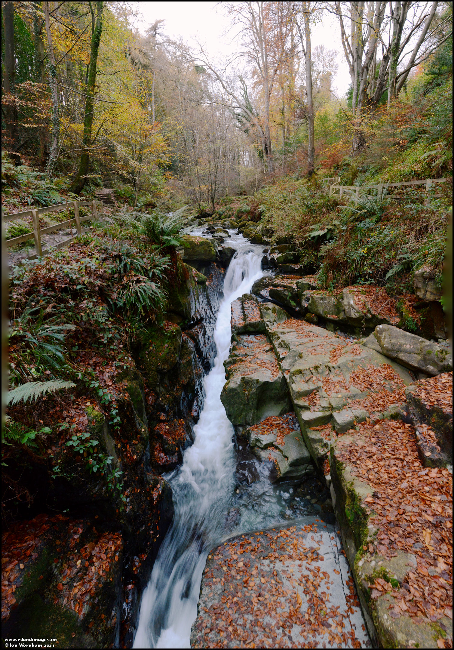 A 'vertical panorama' of the large waterfall, taking in the view from the treetops to almost vertically below, stitched from five original hand held shots.