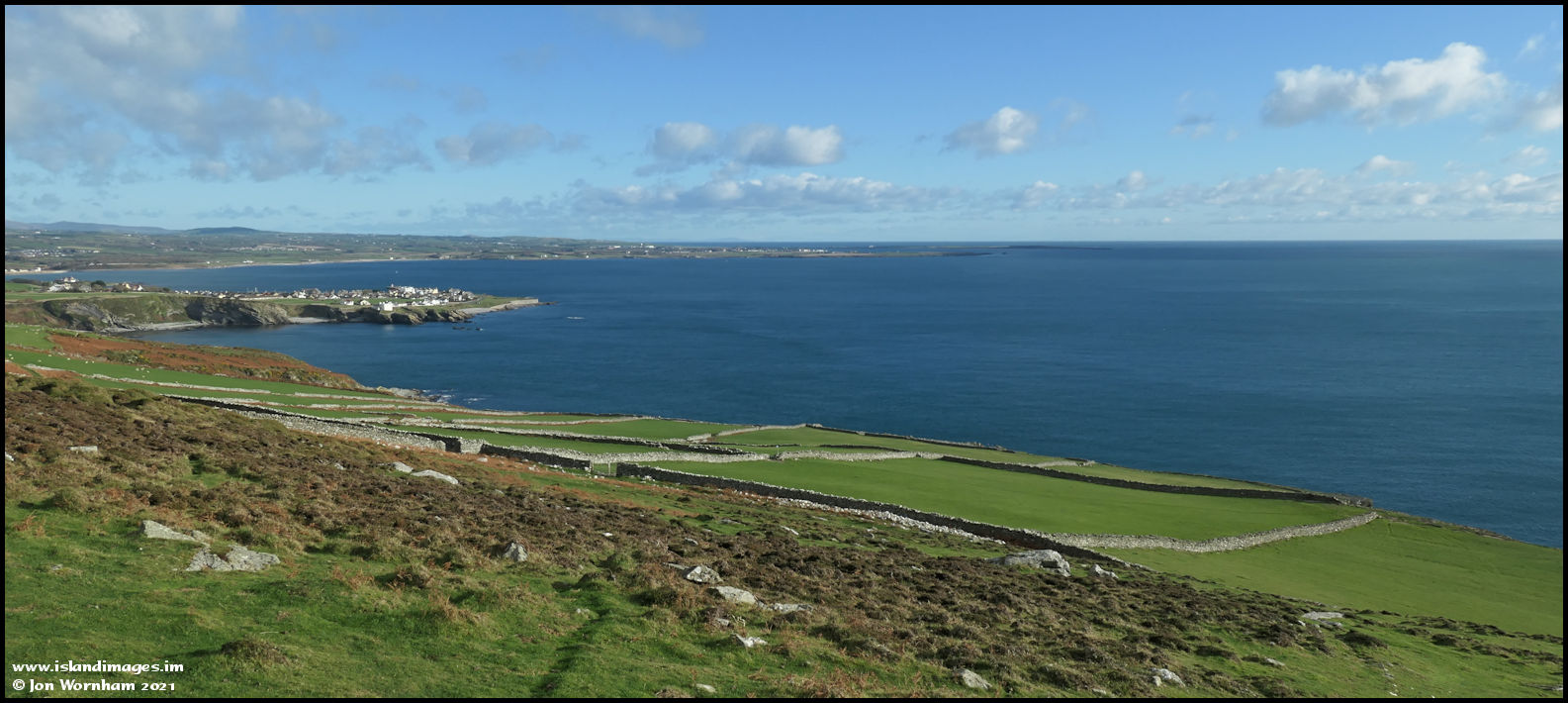 Old stone walled fields above the sea. Scarlett and Langness are in the distance.