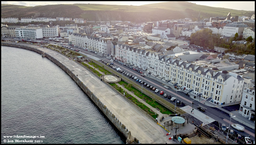 Looking south along Loch Promenade. The 'green corridor' where the Horse Tramway will run between the War Memorial and Sea Terminal can be seen between the parked cars and sunken gardens.