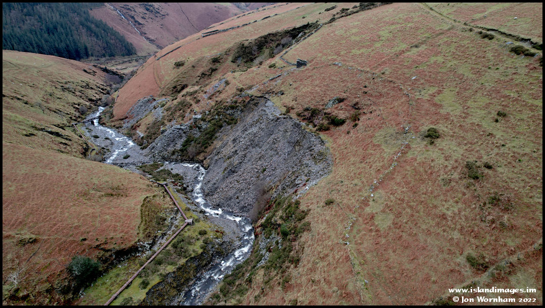 Looking back down the valley to Sulby Glen. I think that all of the slate on the hillsides must be spoil from the quarry. The big pipe carries water to the hydro-electric station in Sulby Glen.