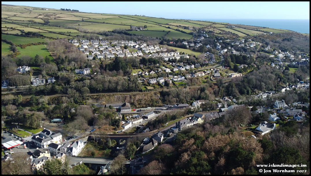 Turning the camara more to look down at the central part of 'New Laxey', with the Manx Electric Railway curving across Glen Roy on its viaduct before looping around and continuing on the far side of the main Laxey valley.