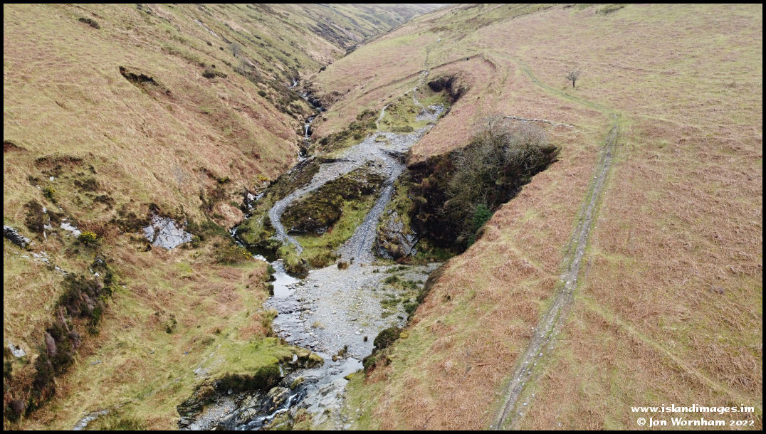 The long abandoned slate quarry at the end of the track. The valley continues on towards Mountain Box on the Mountain Road.