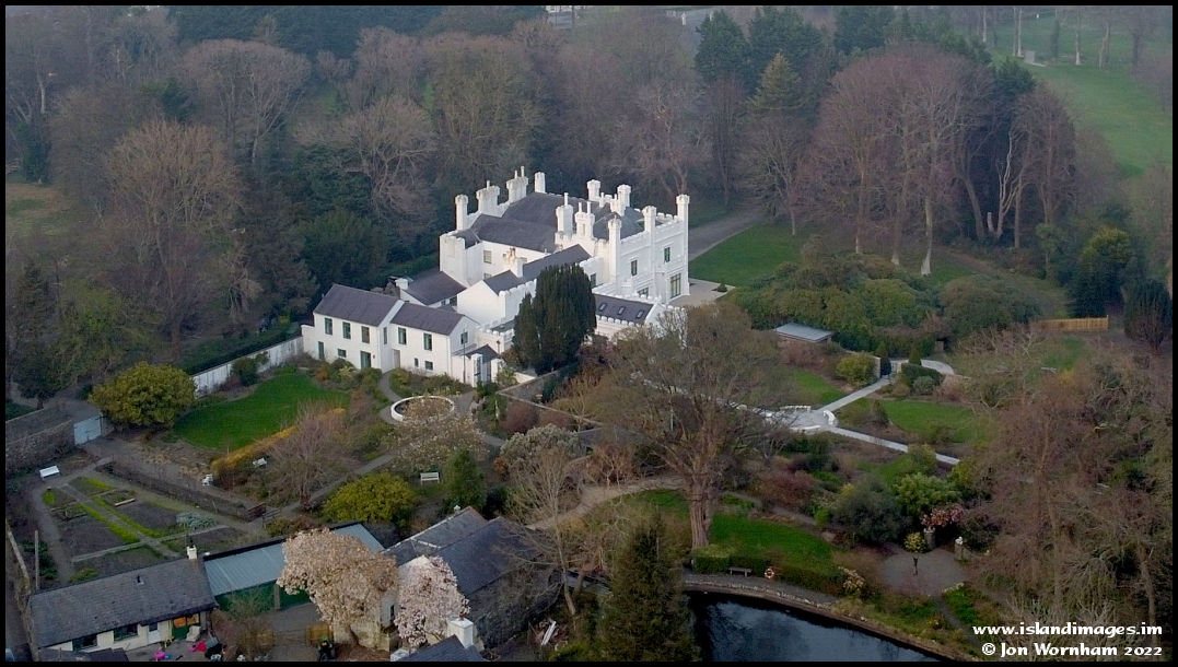 A crop of a larger image showing the holiday rental cottages at the rear of the main house. The two trees in bloom at the bottom are superb Magnolias, with another in bud between them and the house.