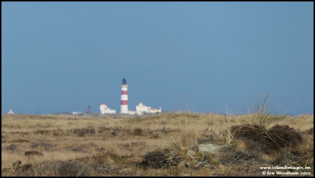 The Point of Ayre lighthouse, shimmering in the heat haze around two and a half miles away. The foghorn and 'winkie' lighthouse on the beach there can also be see.