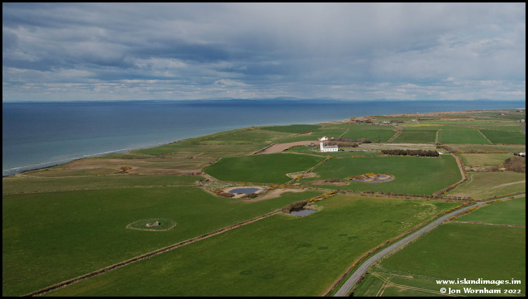 This view is looking across an ancient keeil site to Jurby Church. It was a very clear day and the southern Scottish mountains can be seen on the horizon, despite the wide angle lens on the drone.