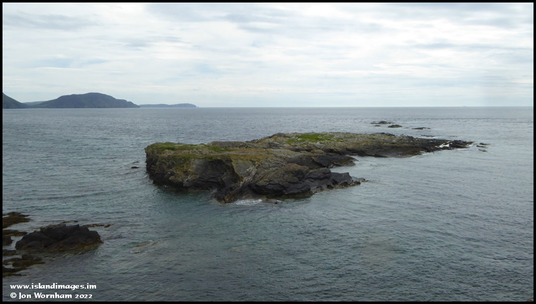The 'Tail of Rock', cut off from the mainland at high tide. Bradda and the Calf of Man in the distance.