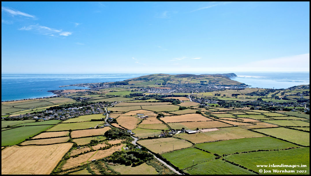 More of less straight over the picnic area here, looking back down the hill towards Port St Mary and Port Erin, with the Calf of Man in the distance.